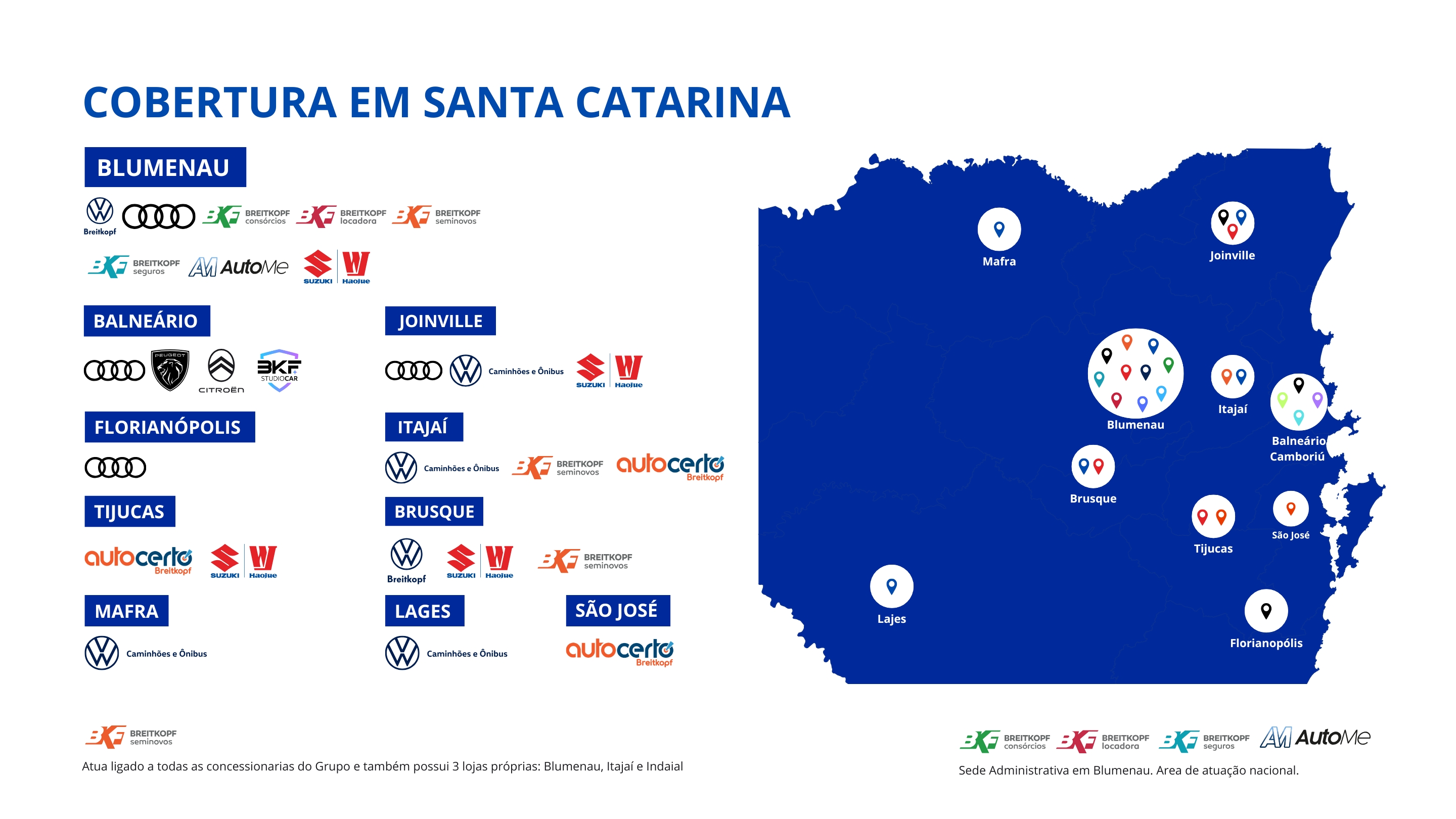 Mais do que representar grandes marcas como Audi Center, Volkswagen, Volkswagen Caminhões, Citroën e Peugeot, construímos uma relação de confiança com nossos clientes, oferecendo soluções completas por meio de nossas marcas próprias: Breitkopf Consórcios, Breitkopf Seguros e Breitkopf Seminovos.